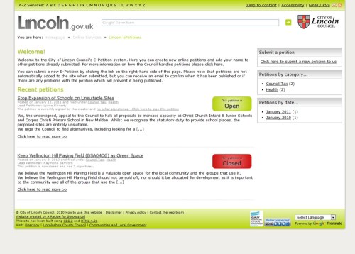 The live system can be accessed here: http://epetitions.lincoln.gov.uk; the screenshot above is from the test system as, at the time of writing, the live system does not have any petitions